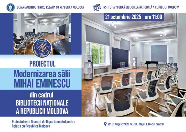 On 21 October 2025, the National Library of the Republic of Moldova inaugurated the “Mihai Eminescu” Hall – a modern, multifunctional space dedicated to culture, art, education, and intellectual dialogue. The modernisation project was financed by the Department for Relations with the Republic of Moldova (DRRM), under the Government of Romania, and implemented by the National Library of the Republic of Moldova.