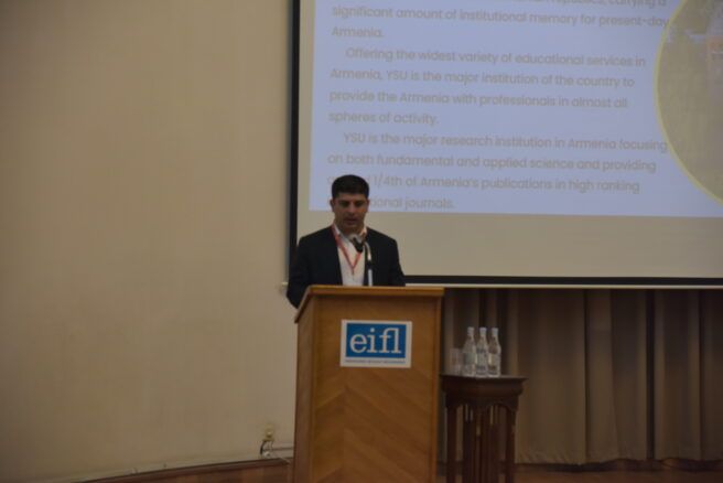 During the first day of the conference, a series of thematic sessions took place, including “Open Science and Information in Armenia”. Rafayel Barkhudaryan, Vice-Rector for Scientific Affairs, Yerevan State University and Dr. Anna Chulyan, the Director of the National Library of Armenia and President of the Armenian Digital Libraries Association delivered their presentations, in which they outlined the current state of open access journals, repositories, and national policies.